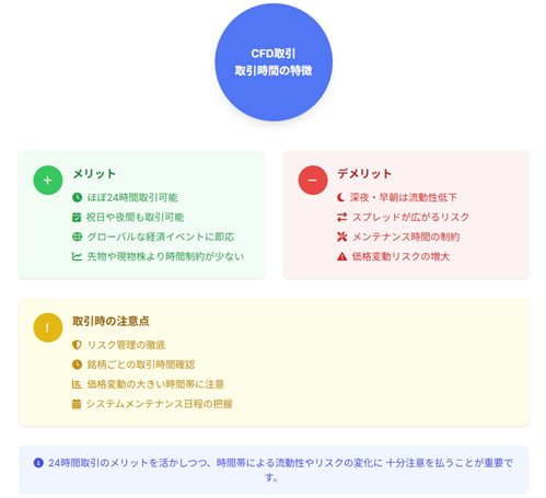 CFD取引の最大の強みは「ほぼ24時間」取引できる柔軟性にあります。日中に取引が難しい人でも、夜間や早朝、さらには祝日でも投資のチャンスを活かせます。