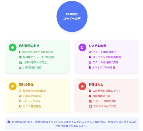 ・「日経平均CFDは先物よりも取引時間が長いので、夜間の値動きにも柔軟に対応できる」という点は、特に兼業投資家や副業トレーダーから高評価です。