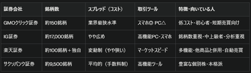 ・初心者・低コスト重視ならGMOクリック証券。手数料無料、スプレッドが狭く、厳選された有名銘柄中心で迷いにくい。