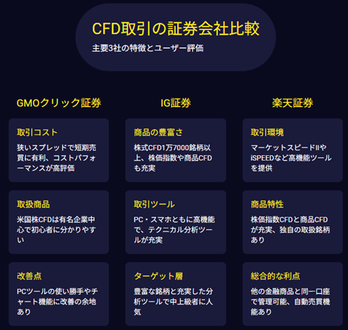 CFD取引を始めるなら、初心者には「GMOクリック証券」、幅広い銘柄を求めるなら「IG証券」、多機能ツールや他商品との連携を重視するなら「楽天証券」がおすすめです。それぞれに強みとユーザー評価があり、取引スタイルや目的に合わせて選ぶことが重要です。