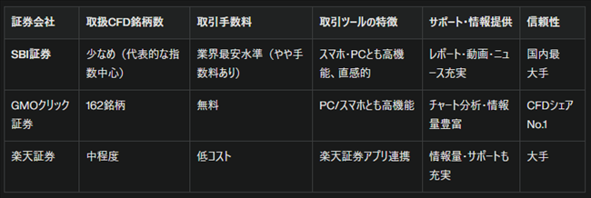 SBI証券のCFD取引(くりっく株365)は、信頼性と操作性の高さ、低コストが魅力ですが、銘柄数の少なさや一部機能面の課題もあり、初心者から中上級者まで幅広くおすすめできる一方で、分散投資や多銘柄取引を重視する方には他社も検討の余地があります。