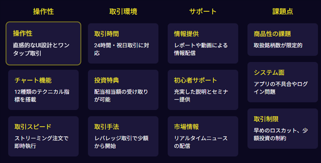一方で、もう少し多くの銘柄を取引したい、あるいは分散投資を重視したい方には、GMOクリック証券など他社の方が選択肢が広がる印象です。CFDで本格的に銘柄分散をしたい場合や、手数料を極力抑えたい場合は他社も比較する価値があるかなとは思いました。
