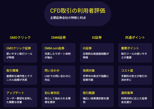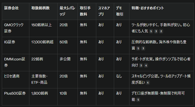 CFD取引でおすすめの証券会社は「GMOクリック証券」「IG証券」「DMM.com証券」などが挙げられます。特に初心者にはGMOクリック証券、豊富な銘柄を求める方にはIG証券、シンプルな操作性とサポート重視ならDMM.com証券が適しています。