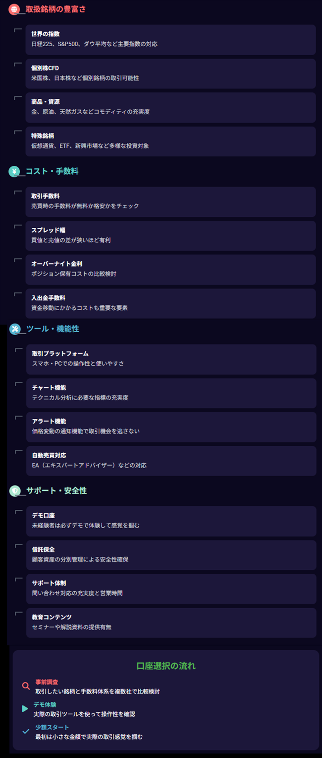 CFD取引口座は「取扱銘柄数の多さ・ツールの使いやすさ・手数料の低さ」で選ぶのが基本です。