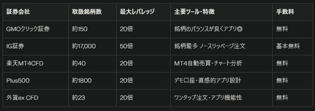 GMOクリック証券はバランスの良さ・手軽さで総合評価が高く、IG証券は圧倒的な銘柄数と機能性、楽天MT4CFDは自動売買やMT4ツール好きにおすすめ、Plus500はデモ体験や直感的な操作性が強みという棲み分けです。