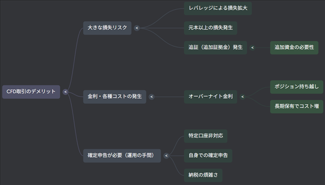 CFD取引の最大のデメリットは「レバレッジによる大きな損失リスク」と「追加証拠金(追証)や確定申告など手間の多さ」であり、安易に始めると手痛い失敗につながる可能性が高いことです。
