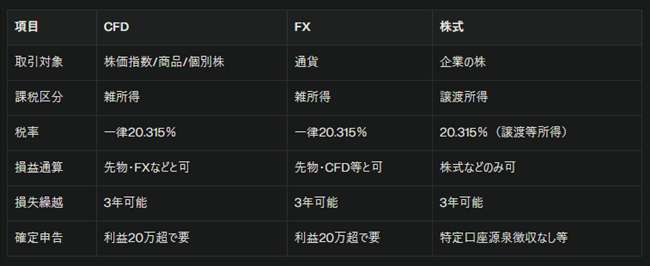 ・CFDはFXと同様、「雑所得」として申告が必要ですが、株式とは税区分が異なります。