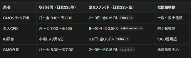 GMOクリック証券のCFD取引時間は、銘柄によりますが「ほぼ24時間」に近い形で月曜〜金曜に利用でき、特に日経225やNYダウでは午前8:10〜翌午前7:00(米国夏時間は7:10〜翌6:00)と非常に長く設定されています。