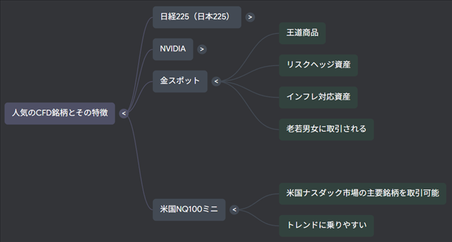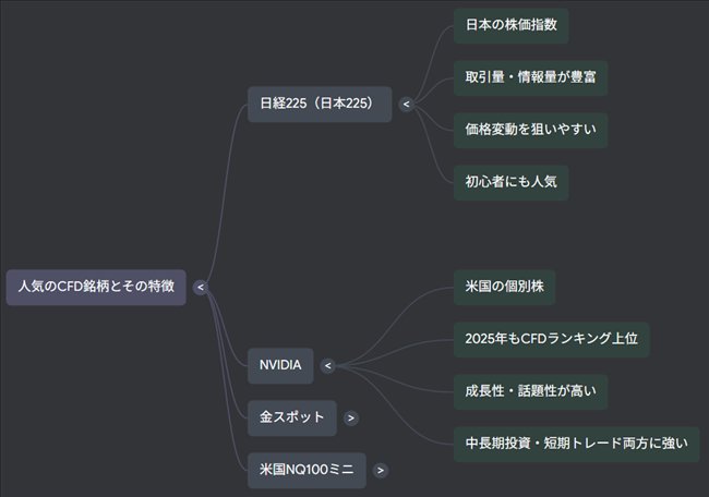 CFD取引でおすすめの銘柄は「日経225(日本225)」「NVIDIA」「金スポット」「米国NQ100ミニ」などが2025年現在も高い人気を集めています。