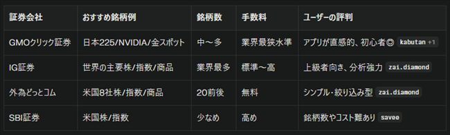 総合的に見ると、日本国内ではGMOクリック証券やIG証券が使い勝手や銘柄数、コスト面で高い評価を得ており、初心者から中級者にもおすすめできる環境です。