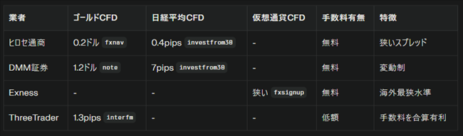 国内CFD業者(例:ヒロセ通商、GMO、DMM)は、多彩な銘柄で比較的狭いスプレッドと無手数料を提供している。例えば、ゴールドCFDなら0.2ドル、日経平均CFDで0.3~7pips水準です。