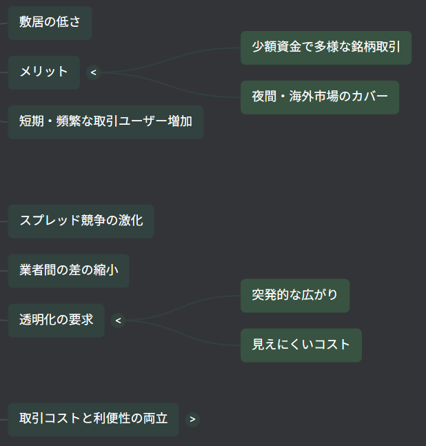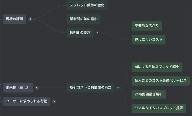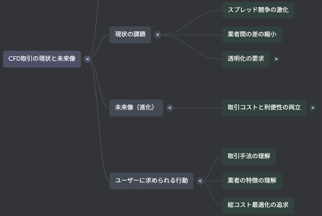 CFD取引で「スプレッド」は、利益を左右する重要なポイントのひとつです。実際のユーザーは総コストを比較し、スプレッドだけでなく手数料、急変時の広がり、使い勝手を総合的に評価しています。今後も技術の進歩と業者比較が進むことで、より有利な環境の提供とユーザーの「納得感」の高くなっていくと思います。
