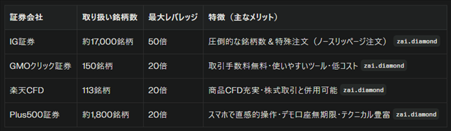 比較情報:主要CFD取引口座の違い