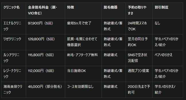 ・料金相場:全身脱毛(顔・VIO含む)は5回で約10万~20万円が相場。キャンペーンや割引も多いので、比較検討が重要です。