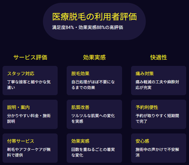大阪で医療脱毛を受けた方の多くが「高い脱毛効果」と「クリニックの丁寧な対応」に満足しており、選択肢の豊富さや立地の良さも魅力です。