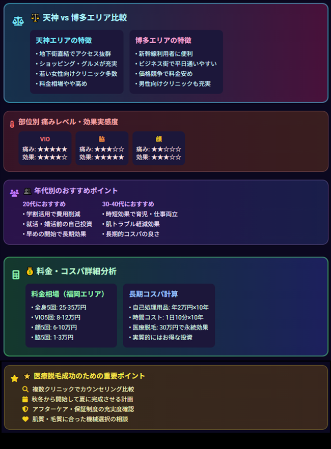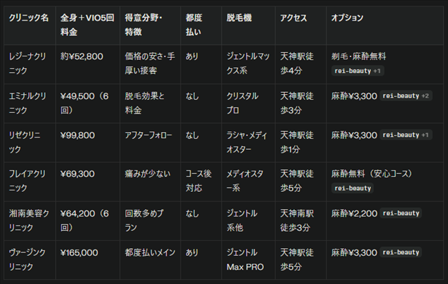 福岡の医療脱毛は「効果が高い」「価格が安い」「駅チカ」「都度払い可能な院も豊富」「スタッフ対応やアフターケアも良好」と、総合的に満足度の高い選択肢が揃っています。