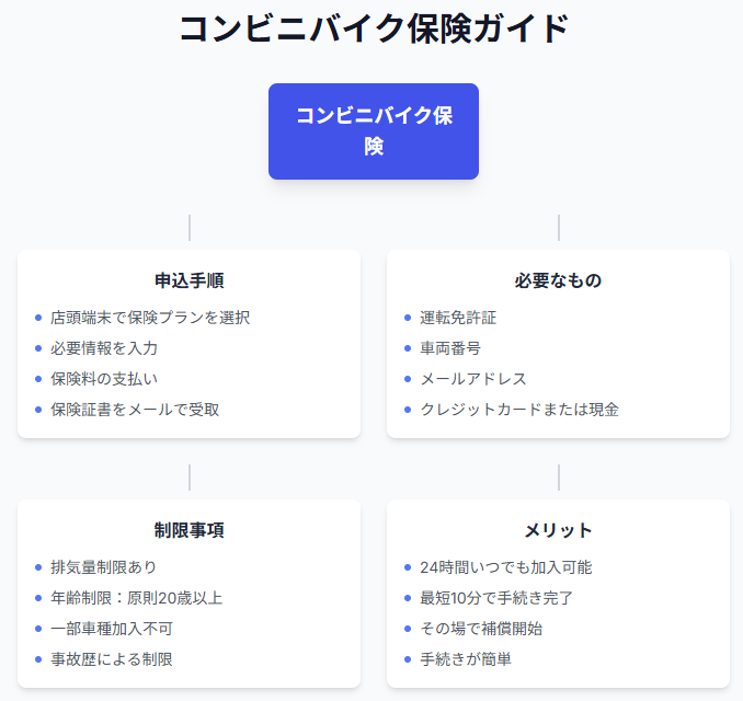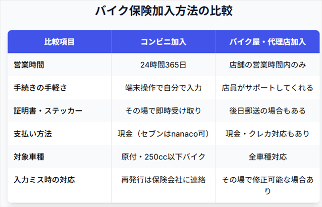 「原付や250cc以下のバイクの自賠責保険は、コンビニで24時間いつでも簡単に加入・更新できて本当に便利!」です。