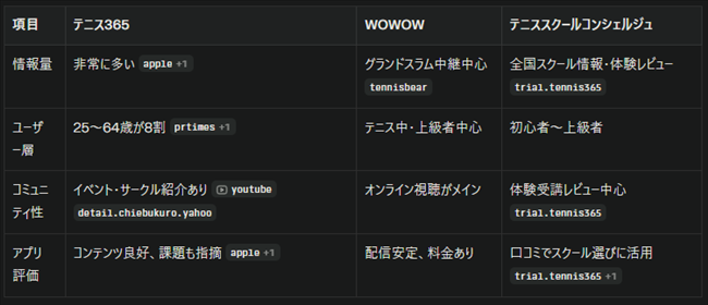 テニス365は、初心者から経験者まで幅広く支持されており、リアルタイムな情報提供と多彩なコンテンツ、コミュニティ機能が特に高い評価を受けています。他サービスと比べても総合力が高く、テニス愛好家にとっては非常に有用なプラットフォームです。