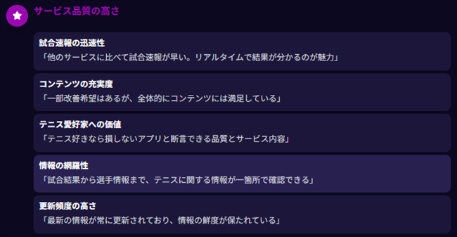 ・情報量が非常に多く、ランキングやニュースなど欲しいテニス情報がすぐに得られる点に評価の声が上がっています。