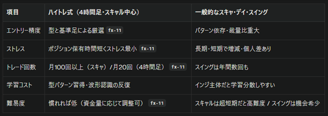 ハイトレ式は「型」と「基準足」による明快な理屈で、初心者が振り回されがちな裁量的迷いを減らしてくれます。とくに、自分のトレード回数やライフスタイルに応じてルール選択ができるので、幅広い層にとって実践的なアプローチです。