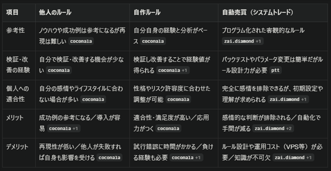 ・メリット:感情取引の防止、失敗の具体的原因分析、勝ちパターンの再現性向上。