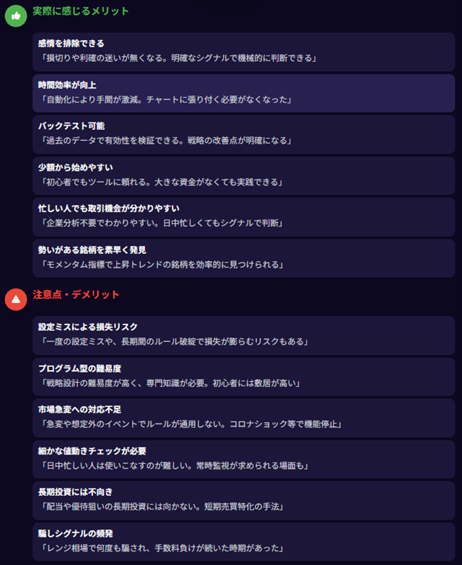 システムトレードルールの最大のメリットは「安定した収益を目指せる点と、感情に左右されない取引ができる点」です。ユーザーとして体験した声、感想、他の投資手法との比較情報を含めて以下に詳しく解説します。